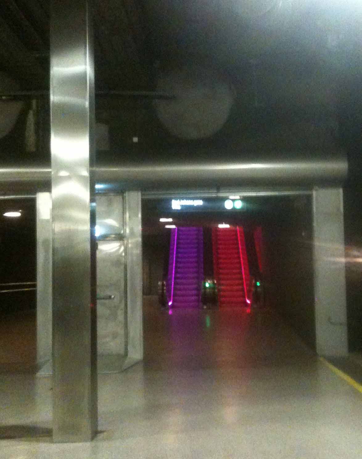 Escalators at National Theatre train station. Choose a lilac or red ride. Light art.