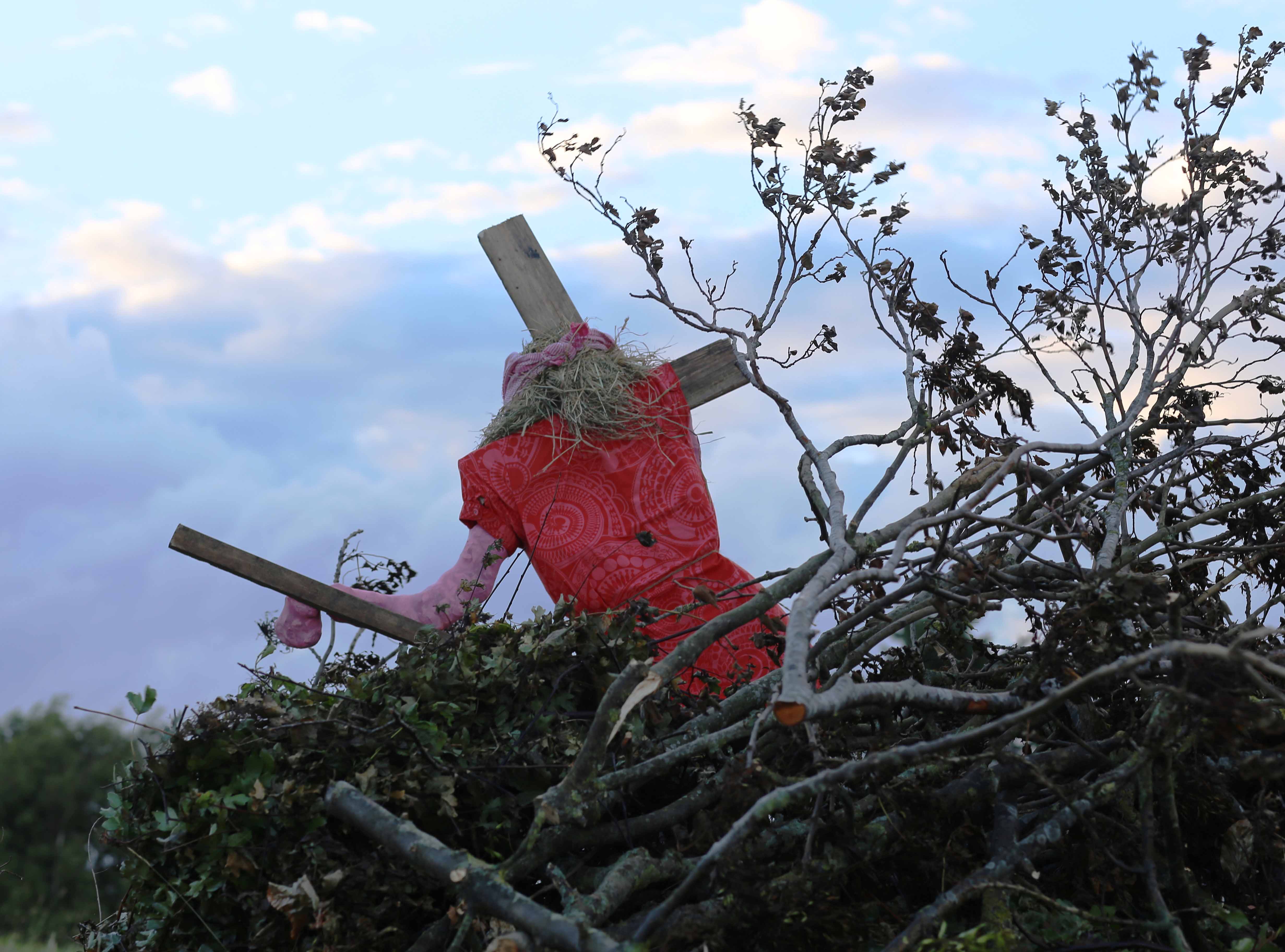 Pile of wood with ‘witch’ on top. Photo from behind, too scary from front!