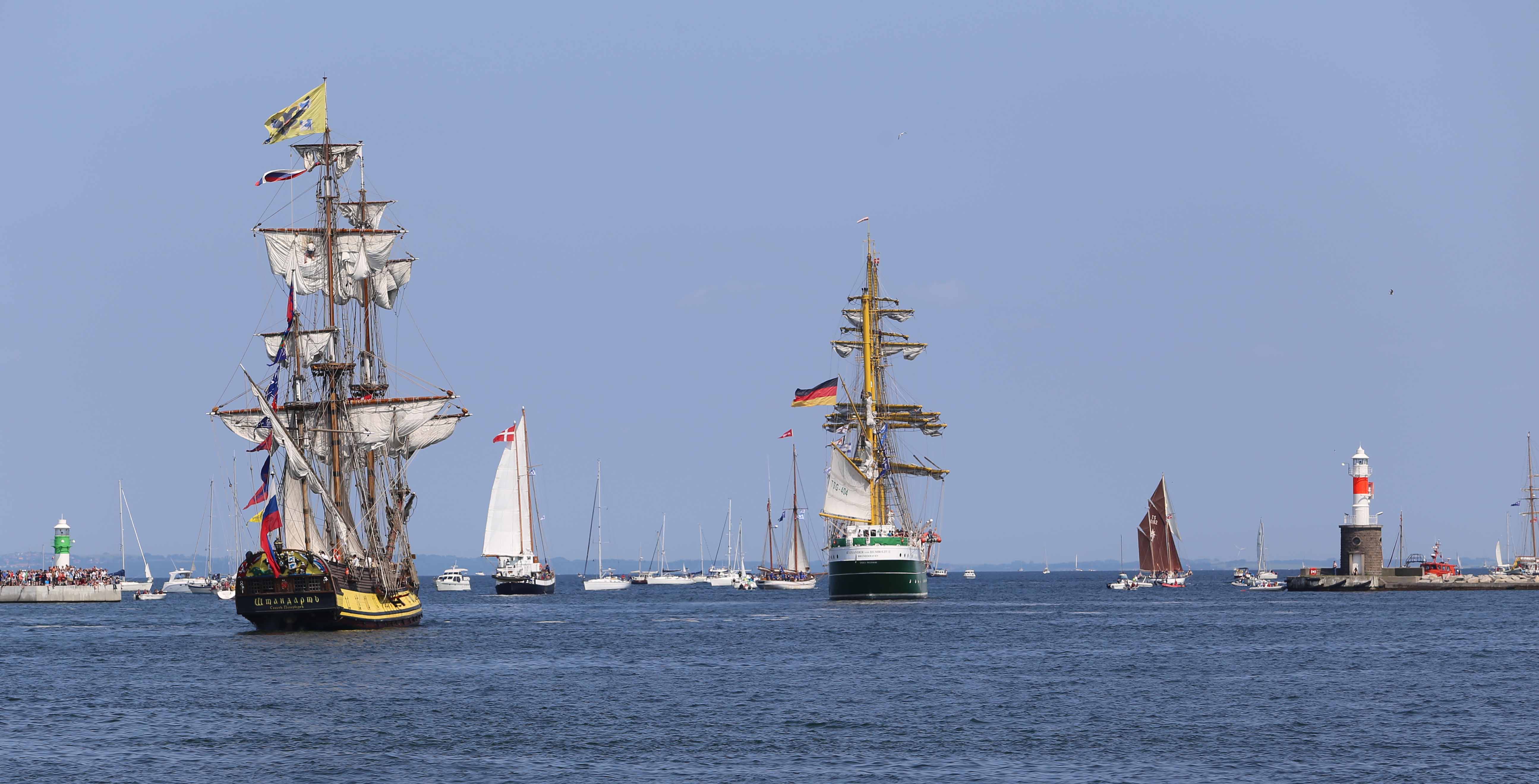 Russian, German, and Danish sailing ship are setting sails and leaving port …