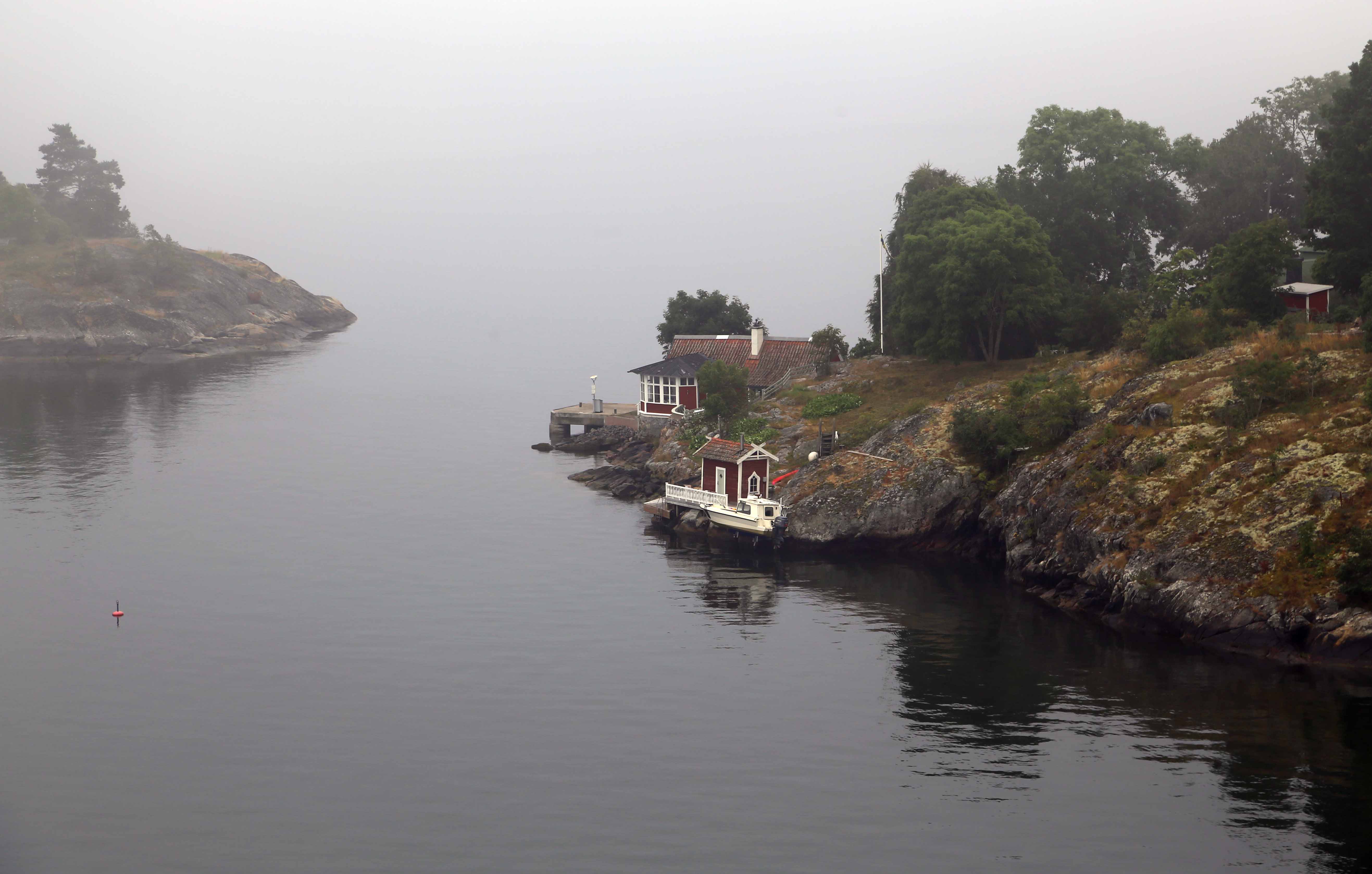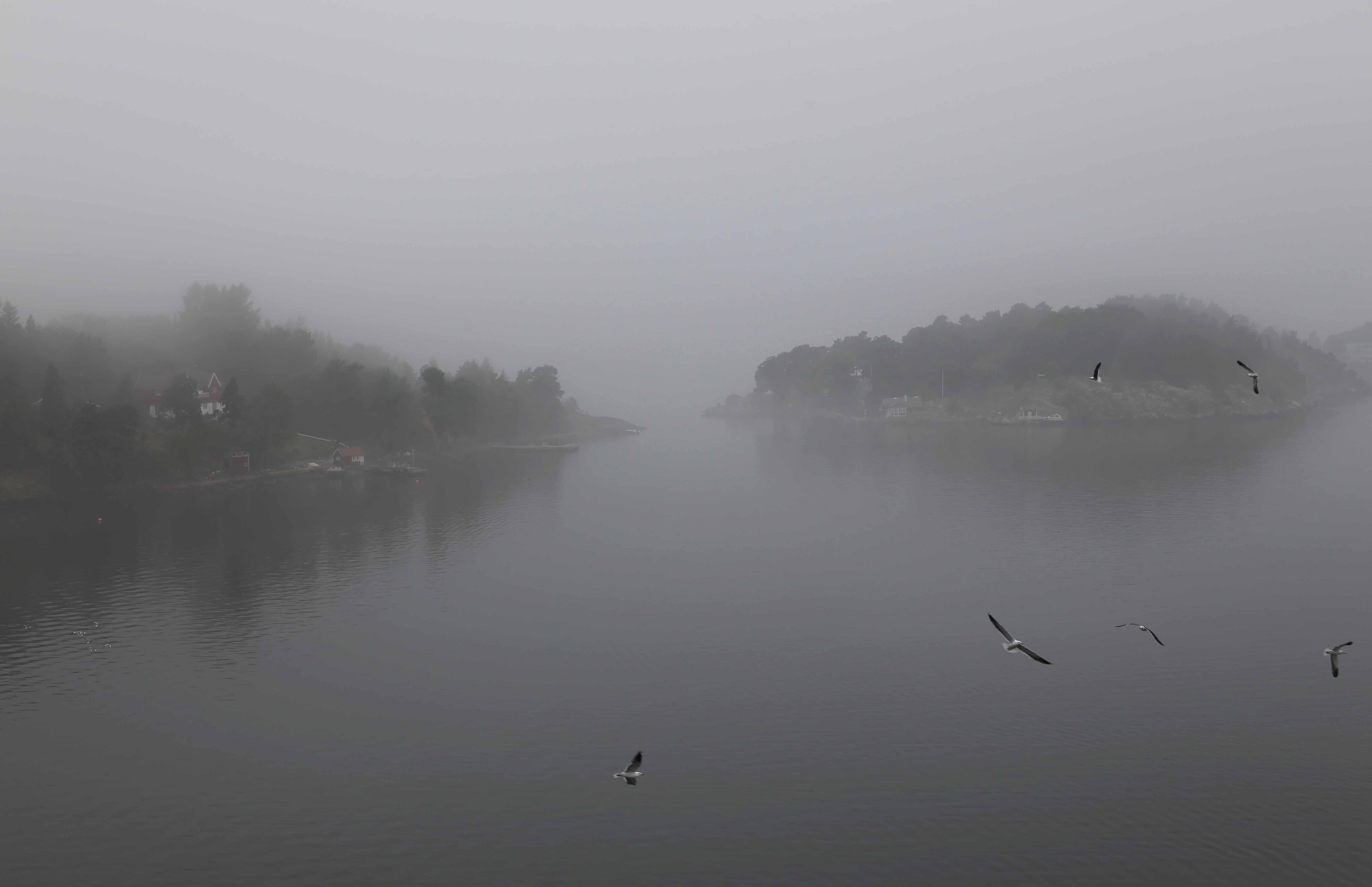 The city is not all that easy to reach by sea; you have sail slowly through a fjord, Skærgård, full of tiny islands (above’n’below on a foggy morning). A feat for a massive cruise ship.