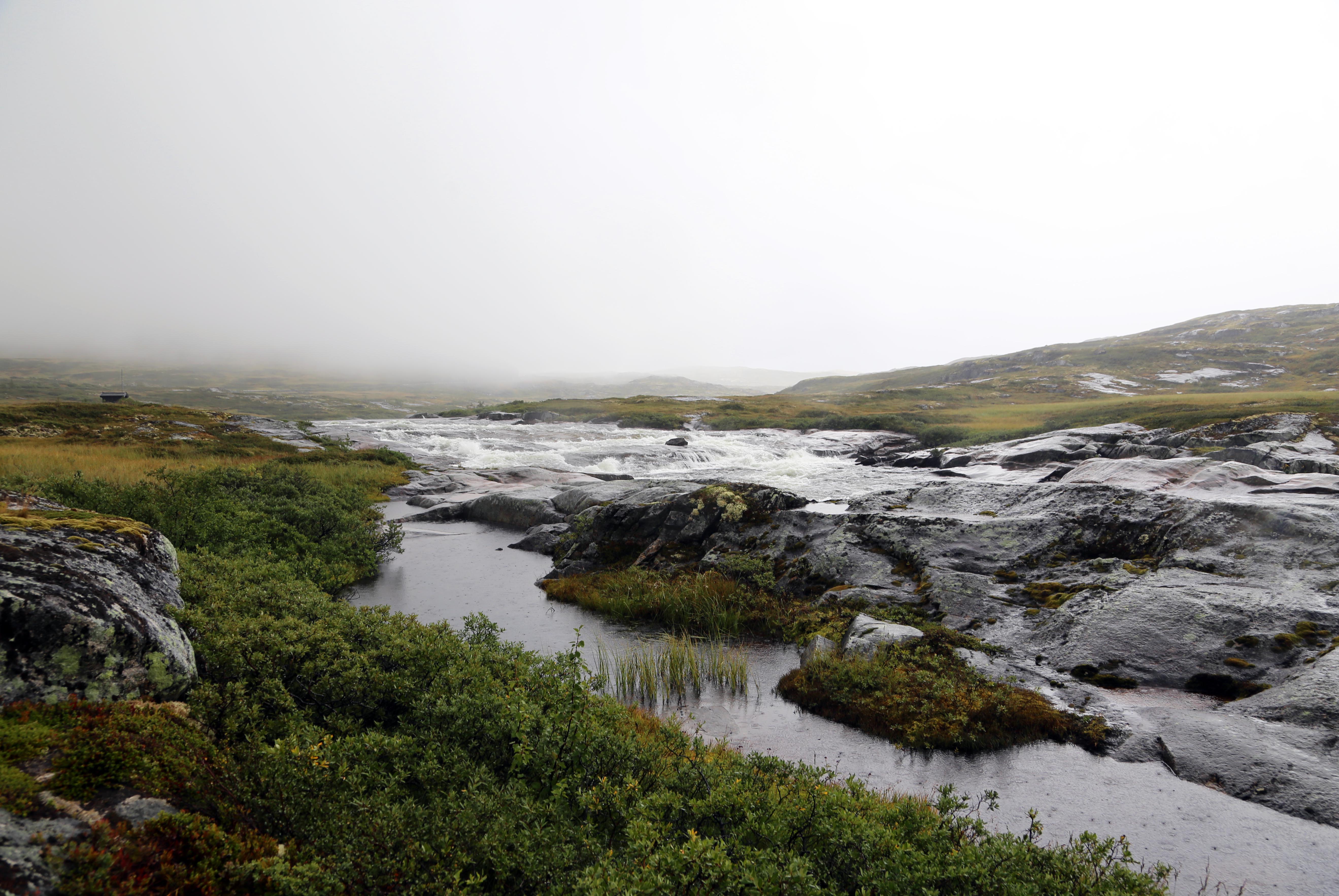 Norway in a nutshell, spectacular landscapes of rocks, water and ice – here Hardangervidda National Park – and ever-changing weather; Fog and rain … again.