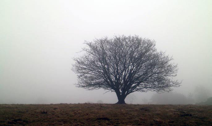 Big, bleak, black trees and fog as backdrop (you can’t help thinking of The Fog by Steven King (or Play Misty for Me, a thriller with the song Misty).