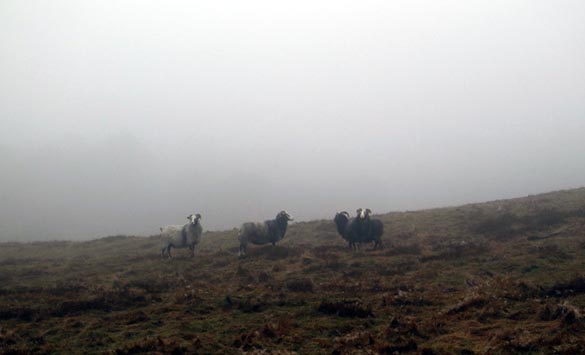 Meet the locals. Sheep. With horn. Curious, but shy. They turn their backs on us and move away.
