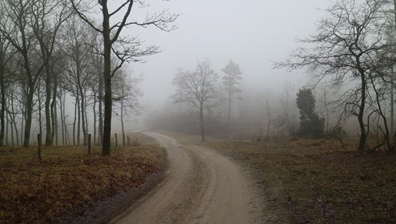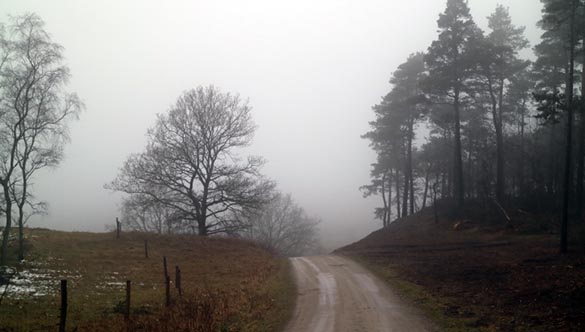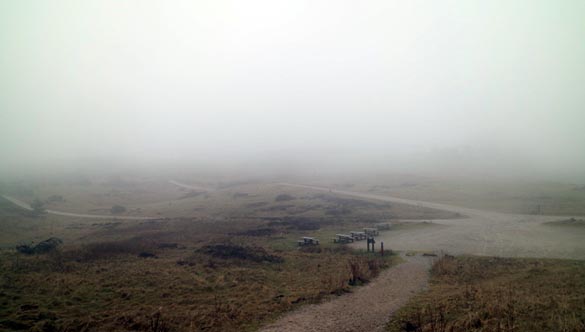 Early weekend morning Djursland, Denmark. Off-season. Cool, moist, misty. In the car and a 20 minute drive by car to Nationalpark Mols Bjerge. Park. Walk.
