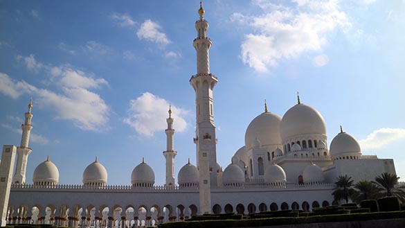 Sheikh Zayed Grand Mosque, Abu Dhabi, the main mosque in the UAE. “Grand” is no exaggeration.Accommodate over 41,000 worshipers. Finished in 2007. Construction spending 4 billion DKK, 545 million USD. Length: 420 m (1,380 ft). Width: 290 m (950 ft). Height largest dome, 85 m (279 ft); 82 domes in seven different sizes and four minarets with a height of 107 m (351 ft).