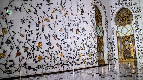 The 96 columns in the prayer hall are covered with marble with decorations of mother of pearl. The columns are exceptionally elegant, beautiful without seeming overly decorated.