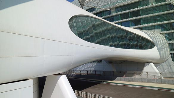 The architects Rani Hashid and Lisa Anne Couture of Asymptote Architects describes it this way: Yas Hotel, a 500-room, 85,000-square-foot complex, one of the main architectural features of the ambitious 36-billion-dollar Yas Marina area and associated Formula 1 racetrack Abu Dhabi, UAE.