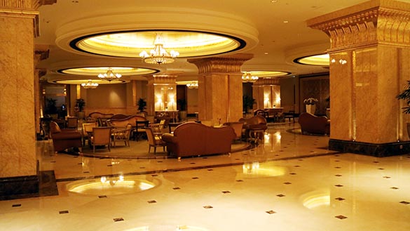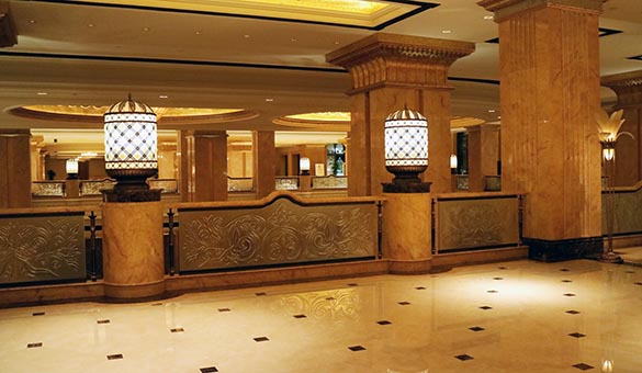 There are seven chandeliers from Faustig in Munich. They consist of millions of Swarovski crystals. The largest of the chandeliers is the world’s third largest and has a diameter of 10 m (33 ft) and a height of 15 m (49 ft).