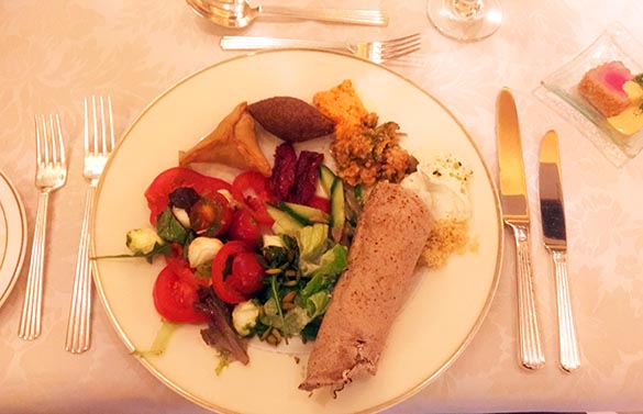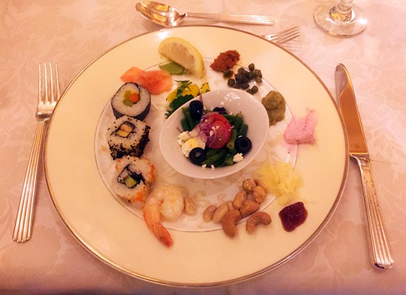 International specialties. The small plate in the middle contains a salad with quail eggs.