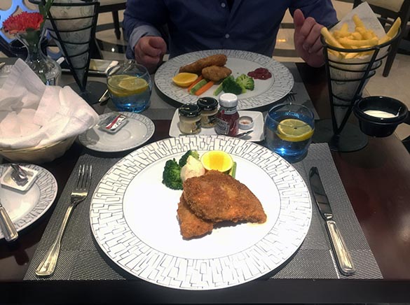 The main course today is fried chicken with french fries. While breaded chicken and fries are far from healthy, this is fresh and tasty, with the fries served in a paper cone on a separate rack and with a tray of tiny Heinz ketchup bottles on the side. Rather neat.