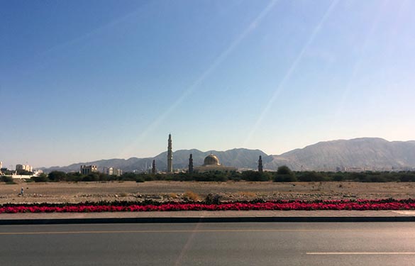 From the border we drive towards Muscat. A flat, yellow-brown landscape dotted with low-rise buildings in white and yellow colors. Here and there are patches of green. In the distant background glimpses of the mountain tops in the Hajjar mountain range.