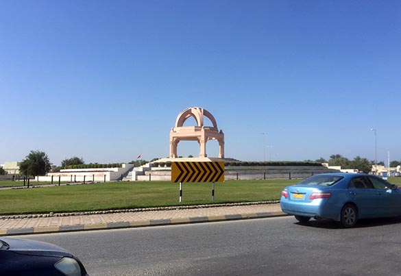 The long straight highway is interrupted at intervals by very large roundabouts with monuments and sculptures.