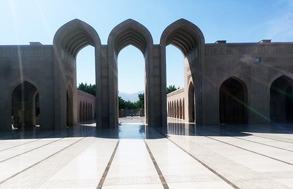 Between the arches and gates you can catch glimpses of the mountain range Al Hajjar Mountains. Everywhere in the otherwise flat landscape you see the dark mountain peaks forming a jagged pattern against the blue sky.