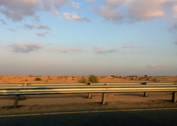 Out in the heat again. We find the car, put the roof down, drive out onto the highway again in the direction of Dubai. We get the last glimpses of the perfectly straight, flower flanked Oman roads and massive roundabouts and monuments.