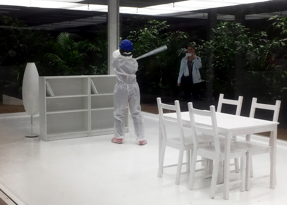 I walk around in the harshly lit glass box emulating a living and dining room. I continue to walk around for quite a while with the bat in my hand patting the other hand with a gesture I remember from crime films. What to do? What to do? What to do?