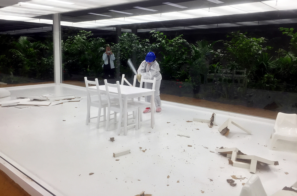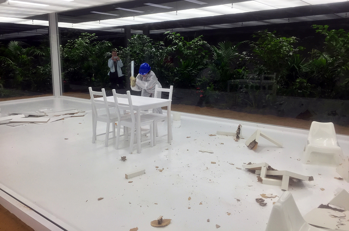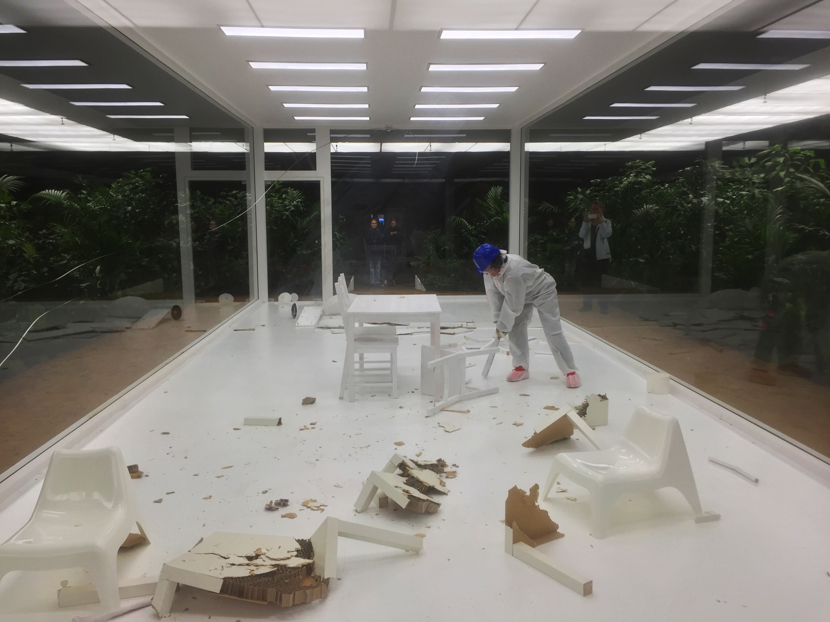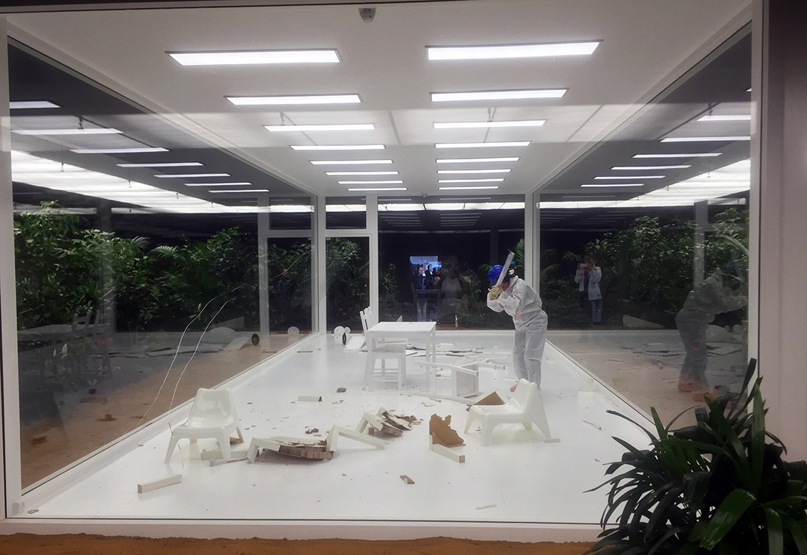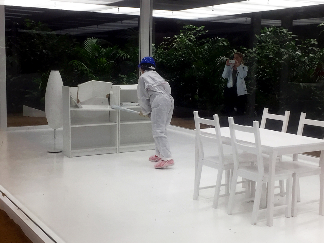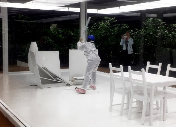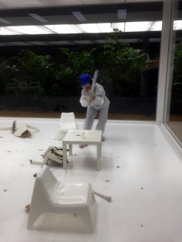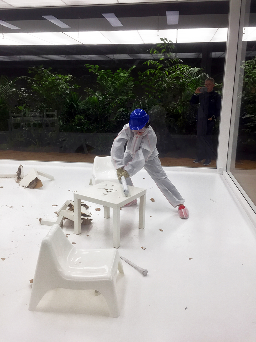 The audience is invited to visit at select times and let some steam out, energy release, by smashing up furniture, glass and porcelain?