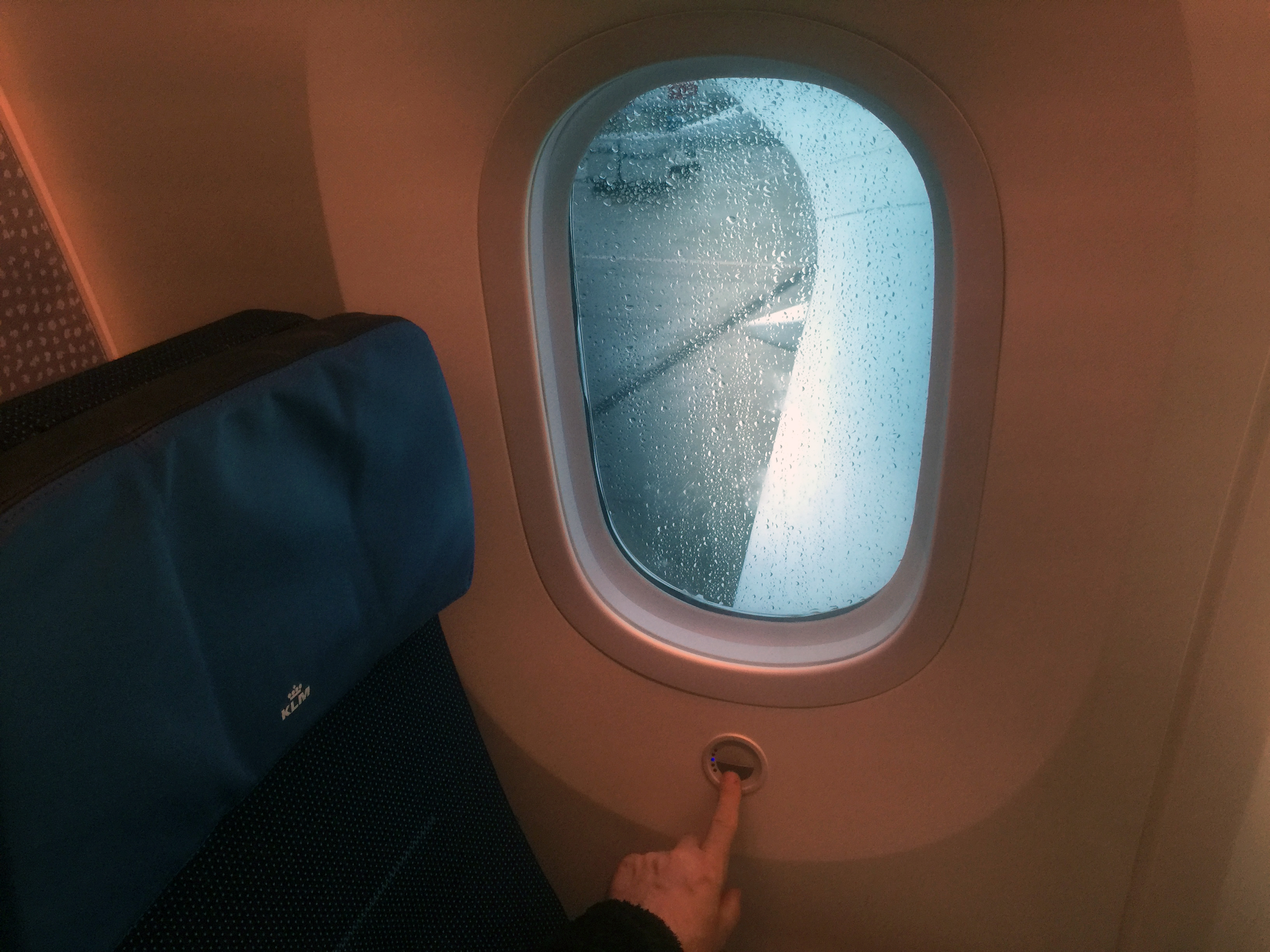 An innovative feature – new to me: At the windows no shutters, but a touch system, so the windows change color from clear to dark blue (in photo only semi-dark but very dark for night flights are possible).