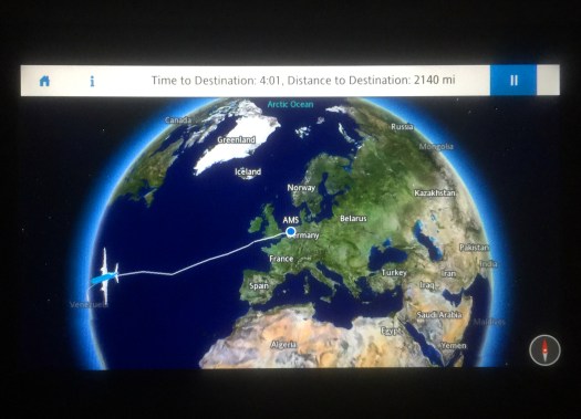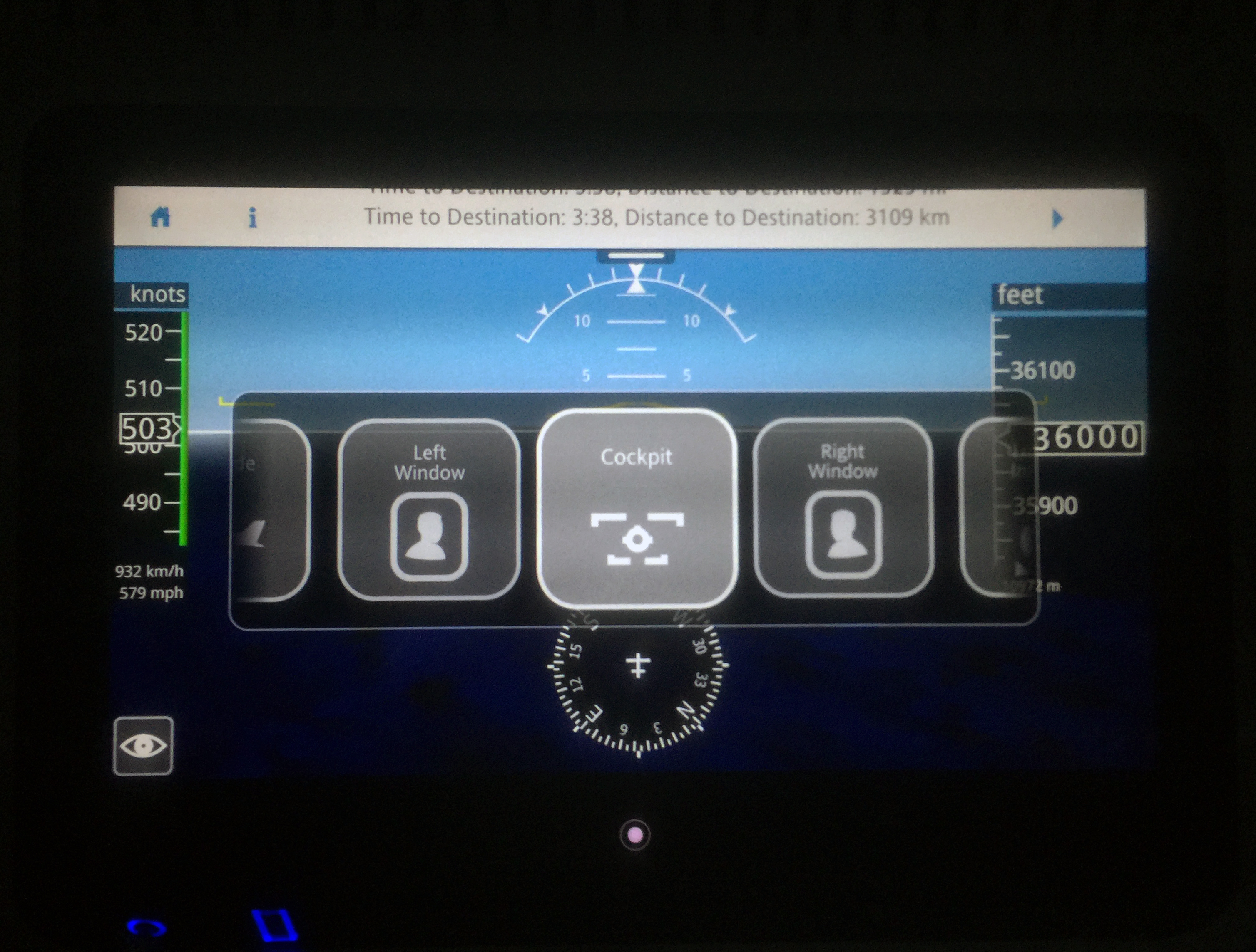 The In-flight entertainment system is brilliant and logical, easy to operate and full of music, games and new feature films. And my favorite channel: Flight information with 3-D view with the option of a ‘view’ from the cockpit, right or left side of the plane or from above. With info about: Time to destination. Local time of departure. Local time of arrival. Height and speed.