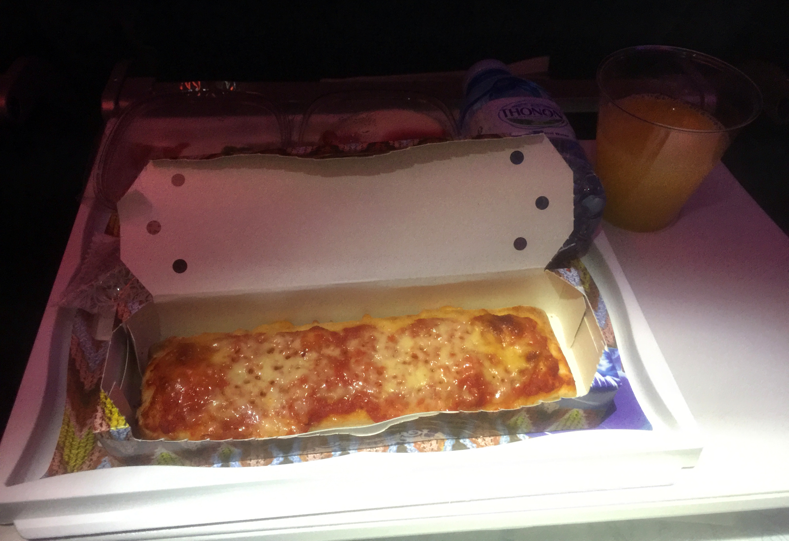 A few hours before landing a light evening meal: A kind of pizza bread (!), A delicious caprese salad (mozzarella and tomato and spices) and a mousse dessert.