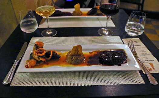 Pirogues with crab and slow cooked ox tail with two kinds of sauces. Delicious.