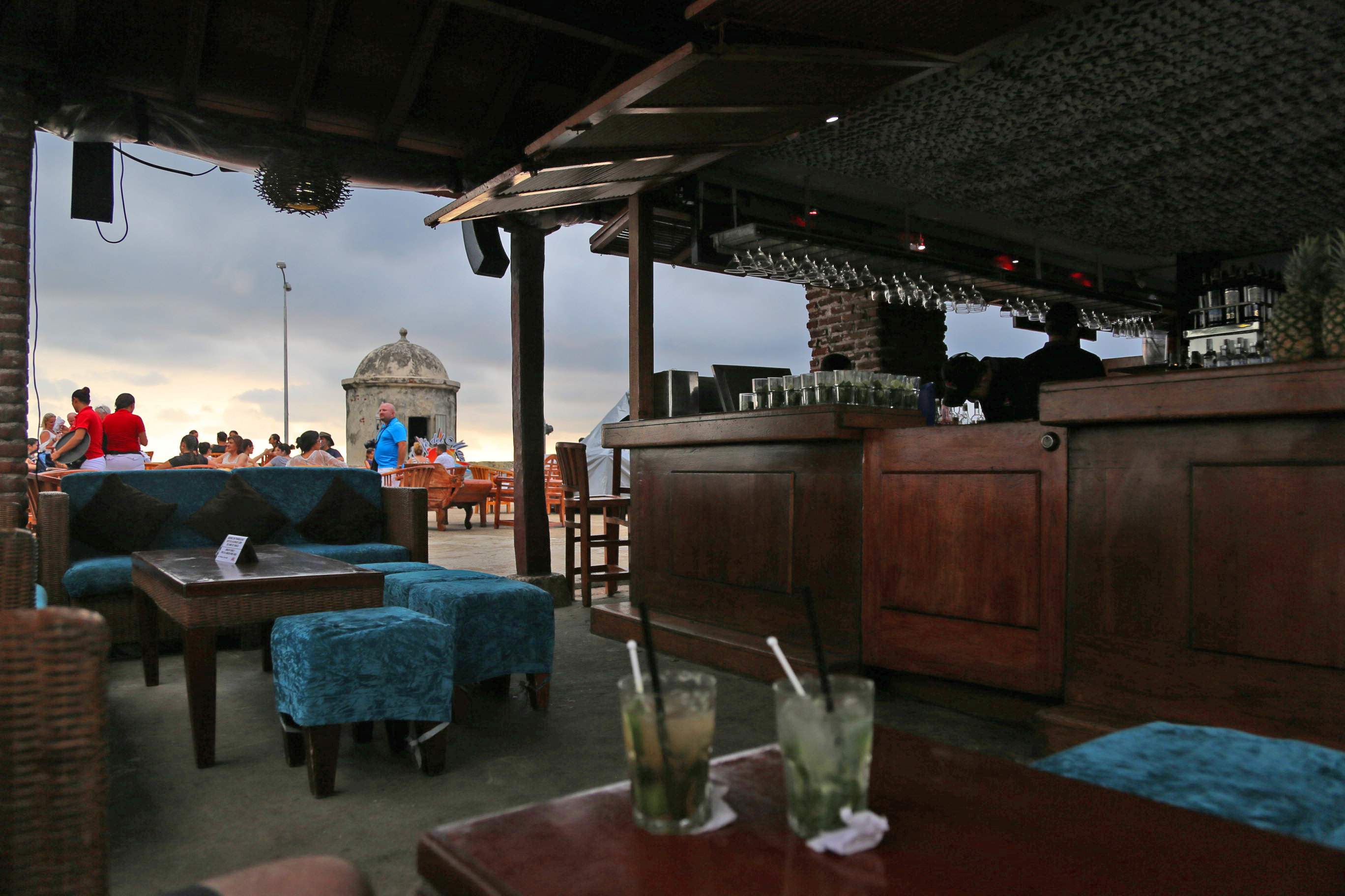 The place is popular, understandably so. The bar is located on the massive city wall overlooking the guard towers, cannons, ancient buildings and the Caribbean Sea.