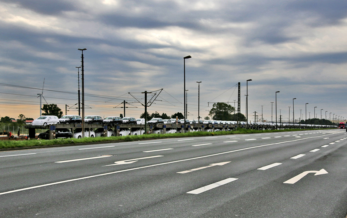A massive port and cars, cars and cars. Among other sights, a kilometre-long vehicle train packed with cars, bumper by bumper.