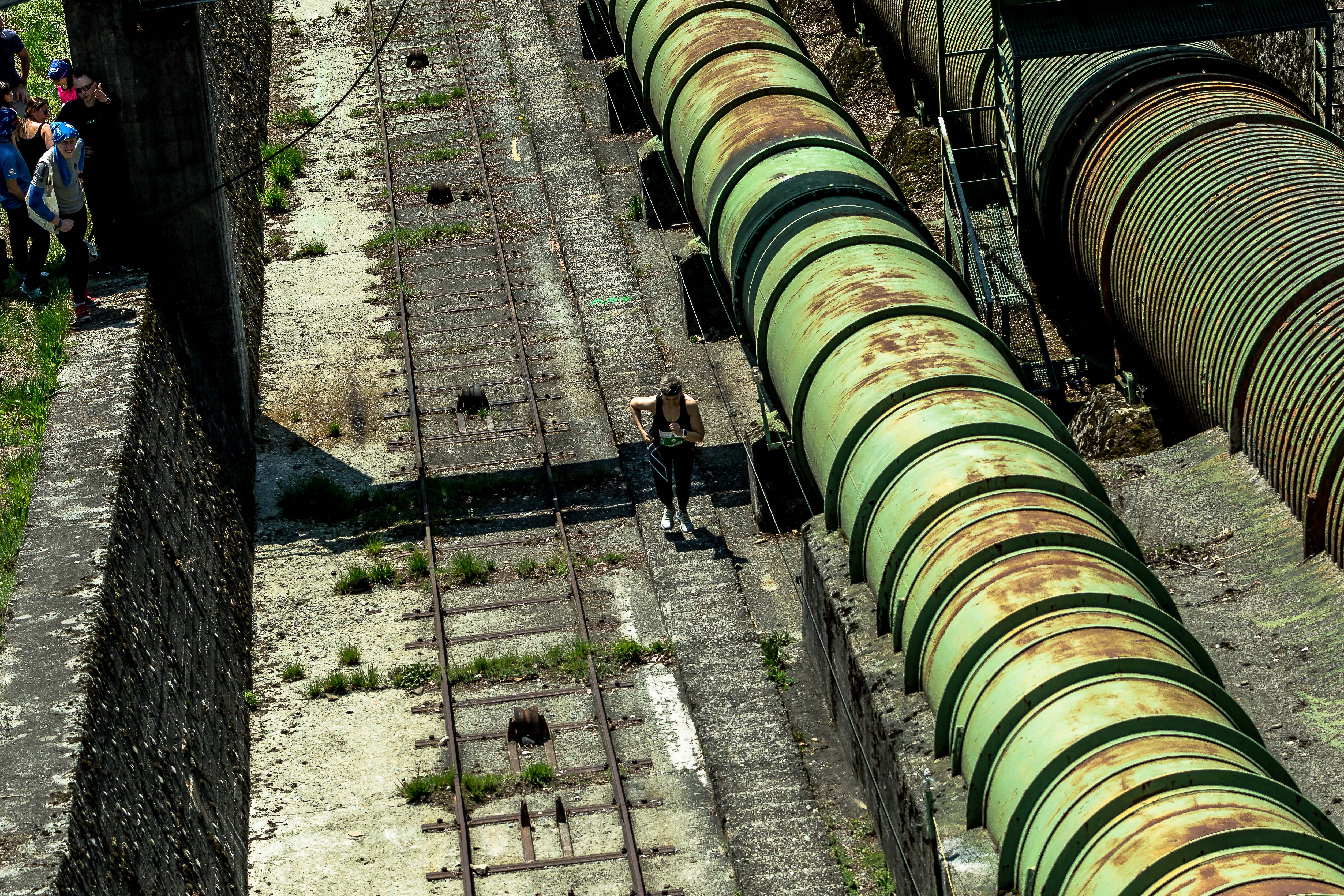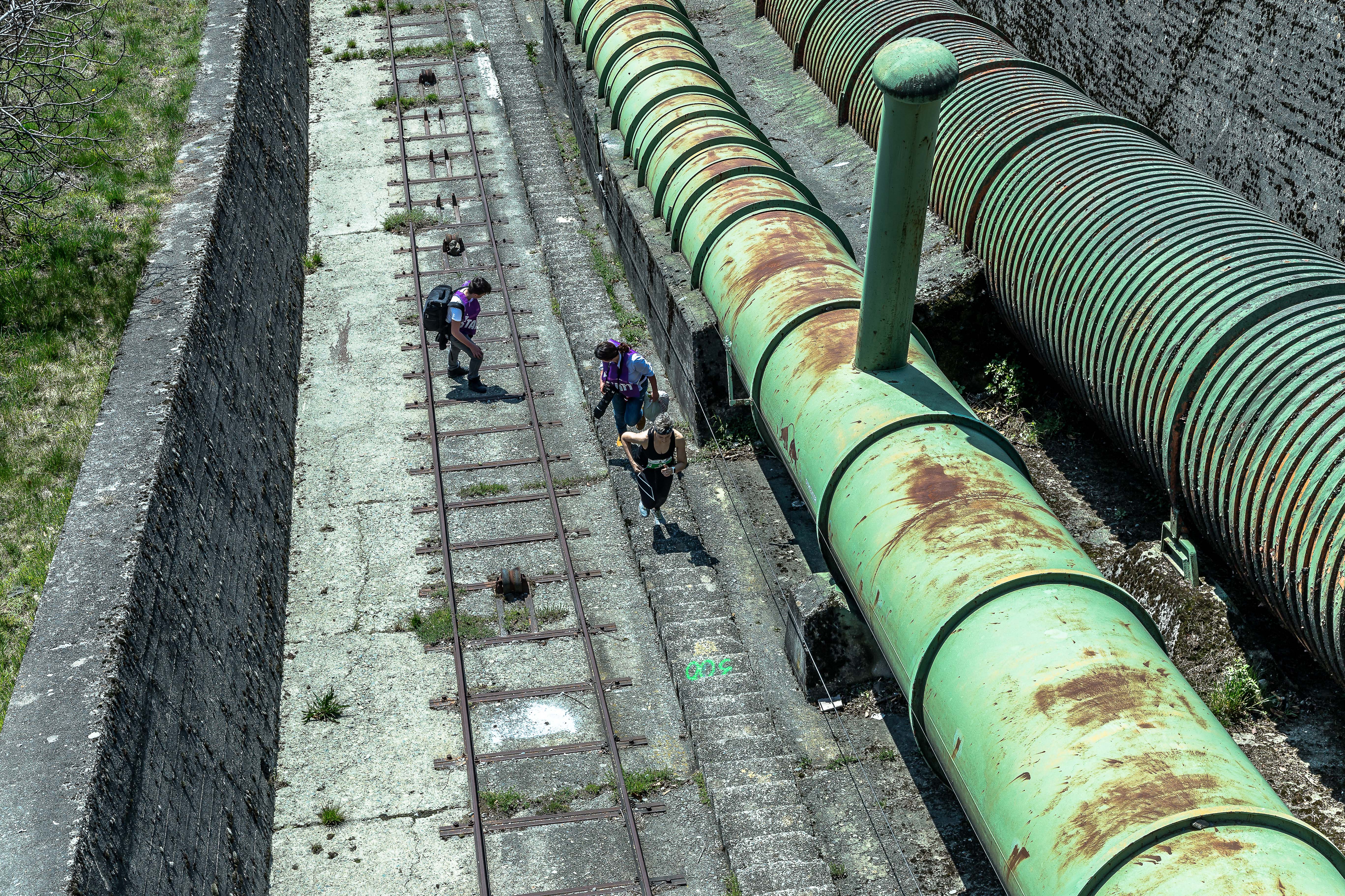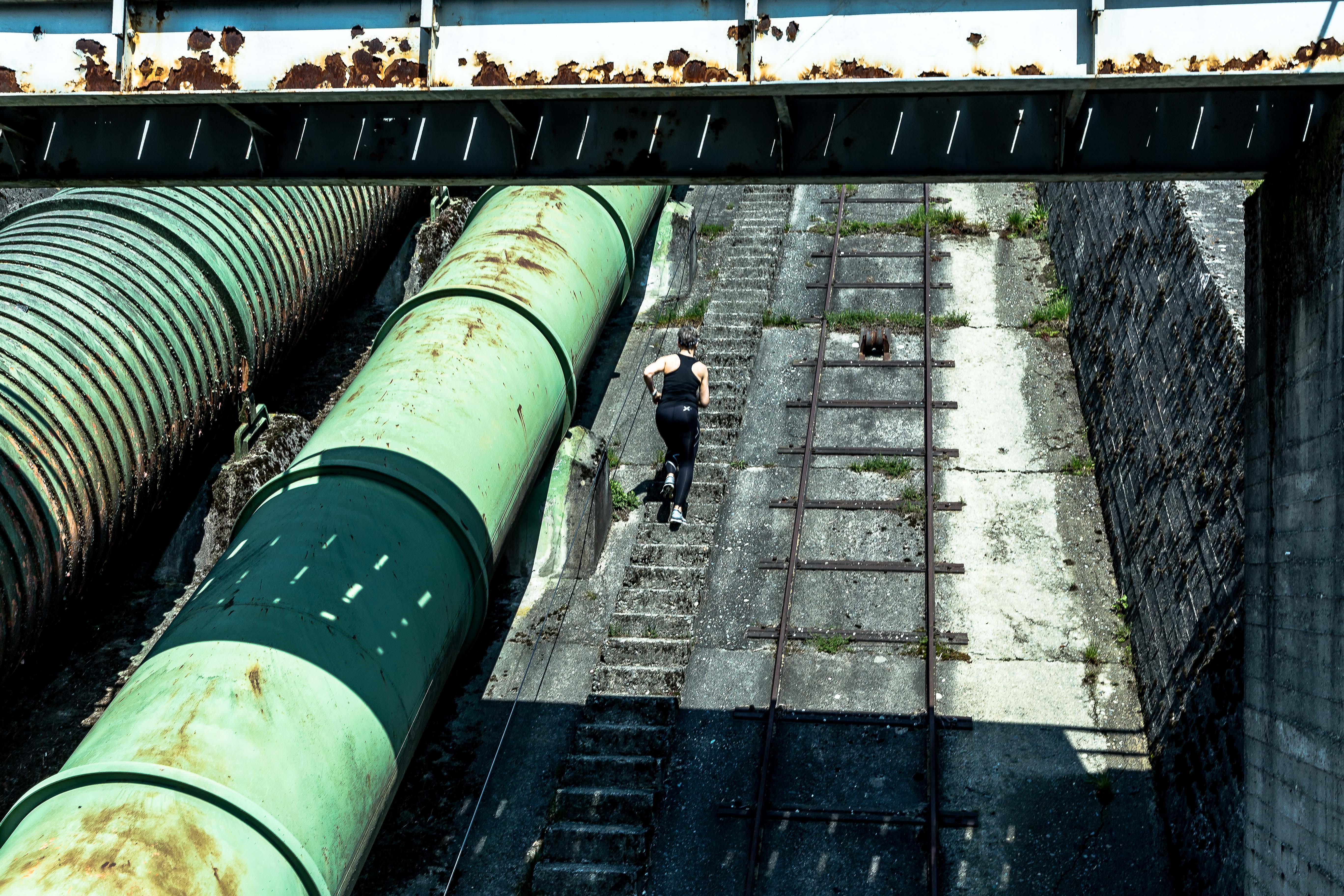 However, the steep, sloping concrete looks tricky, so I try to pick up speed (by 0.5 steps per minute), because at intervals there are large concrete pillars, which support the pipes and I want to get to one of them to lean on.