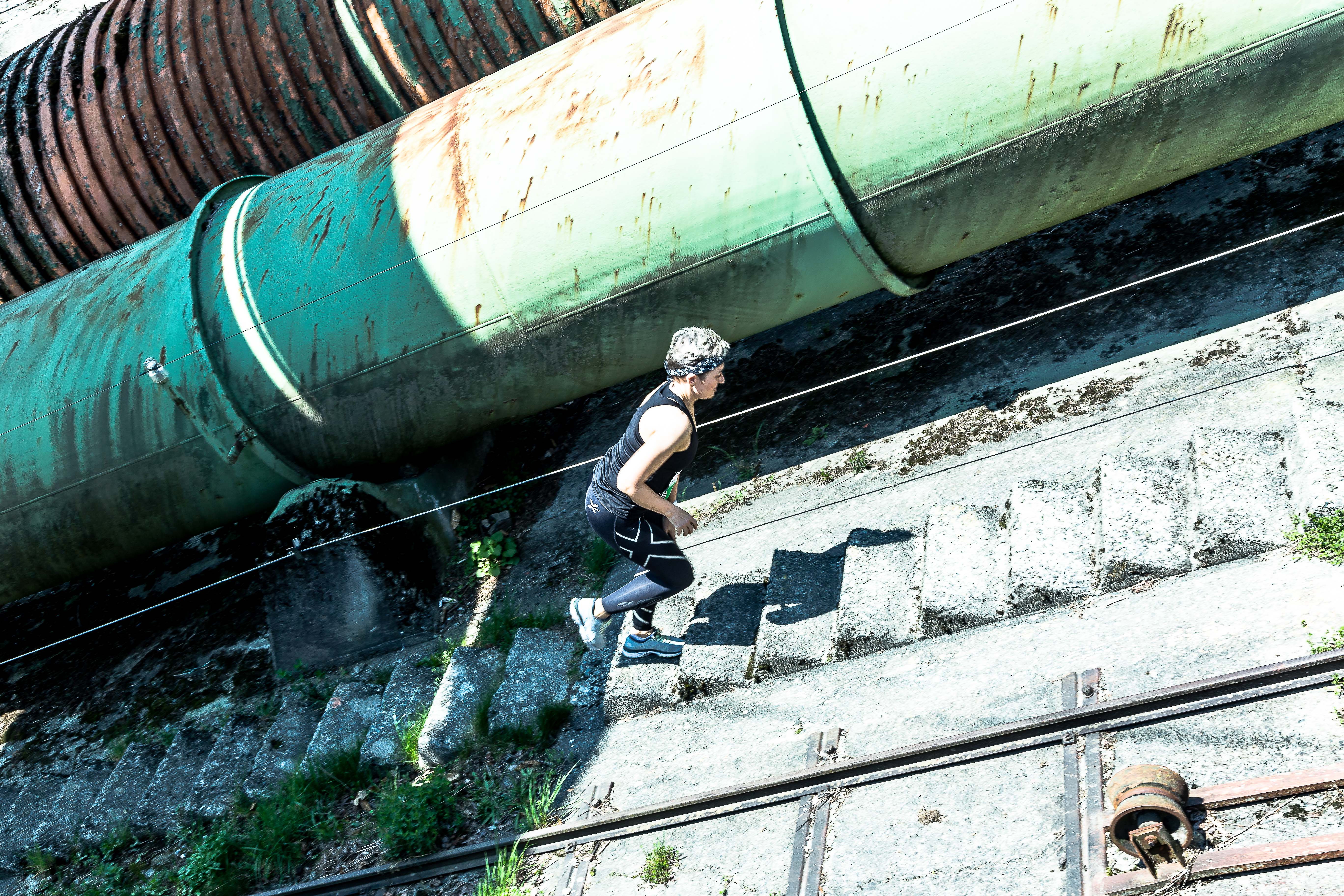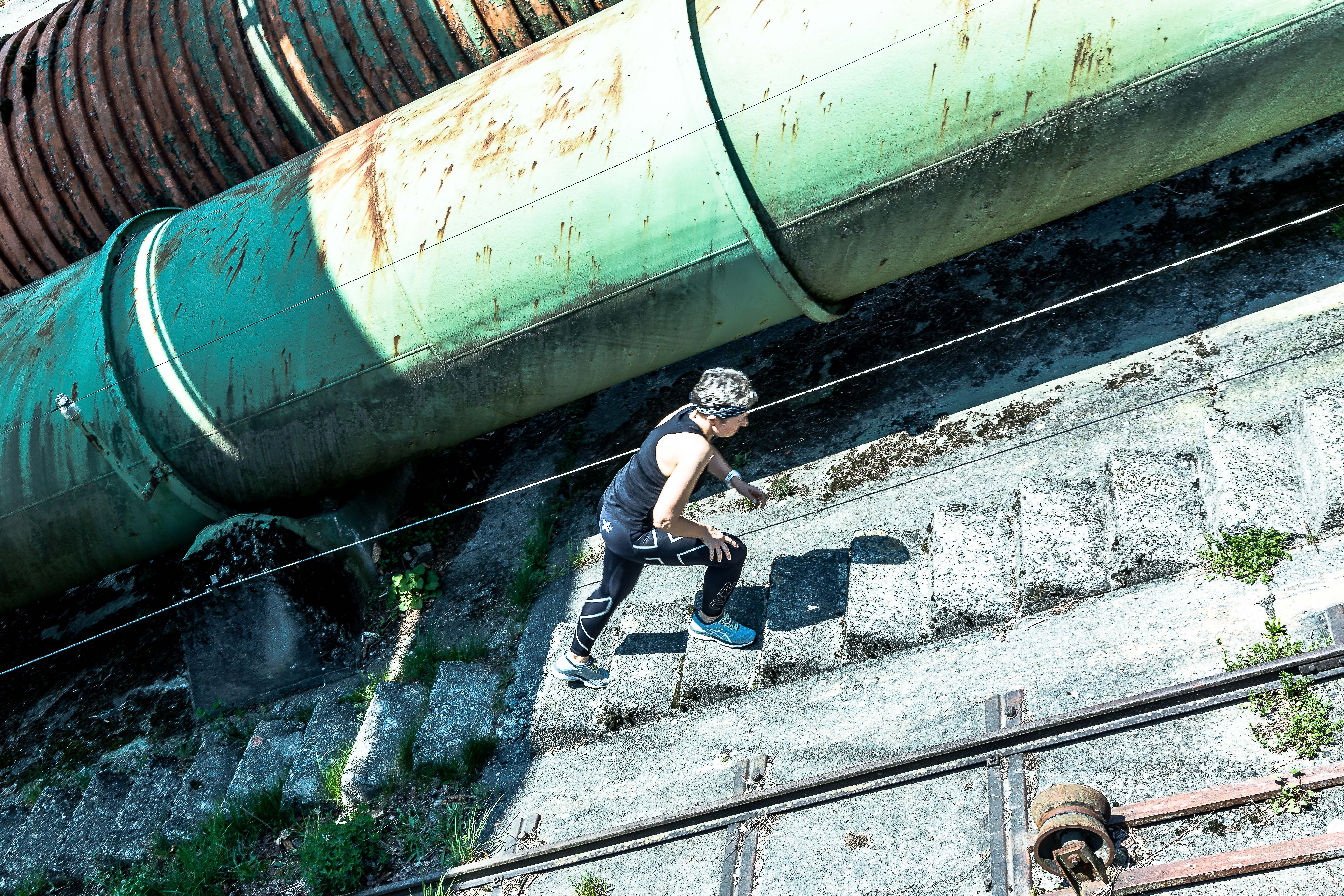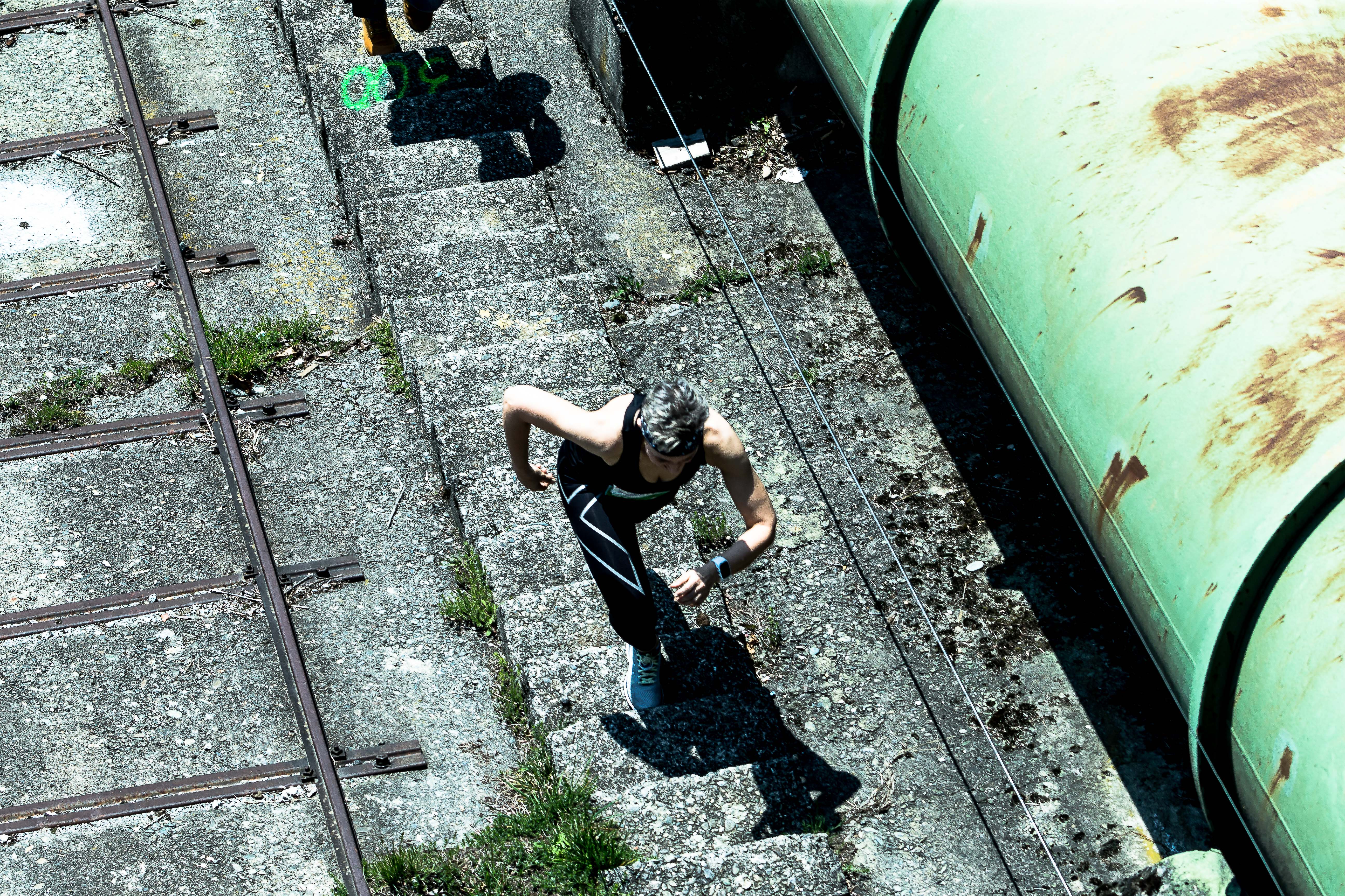 I make do with 3 minutes of low-intensity lower body movements, which do not get my heart rate up – also I am trying to save my legs a little and think, the walk up the 50-75 steps to the starting block will do the trick. Completely against my own typical advice on thorough warm-ups, I’m not warmed up properly for this extreme race (talk about extreme … stupidity).