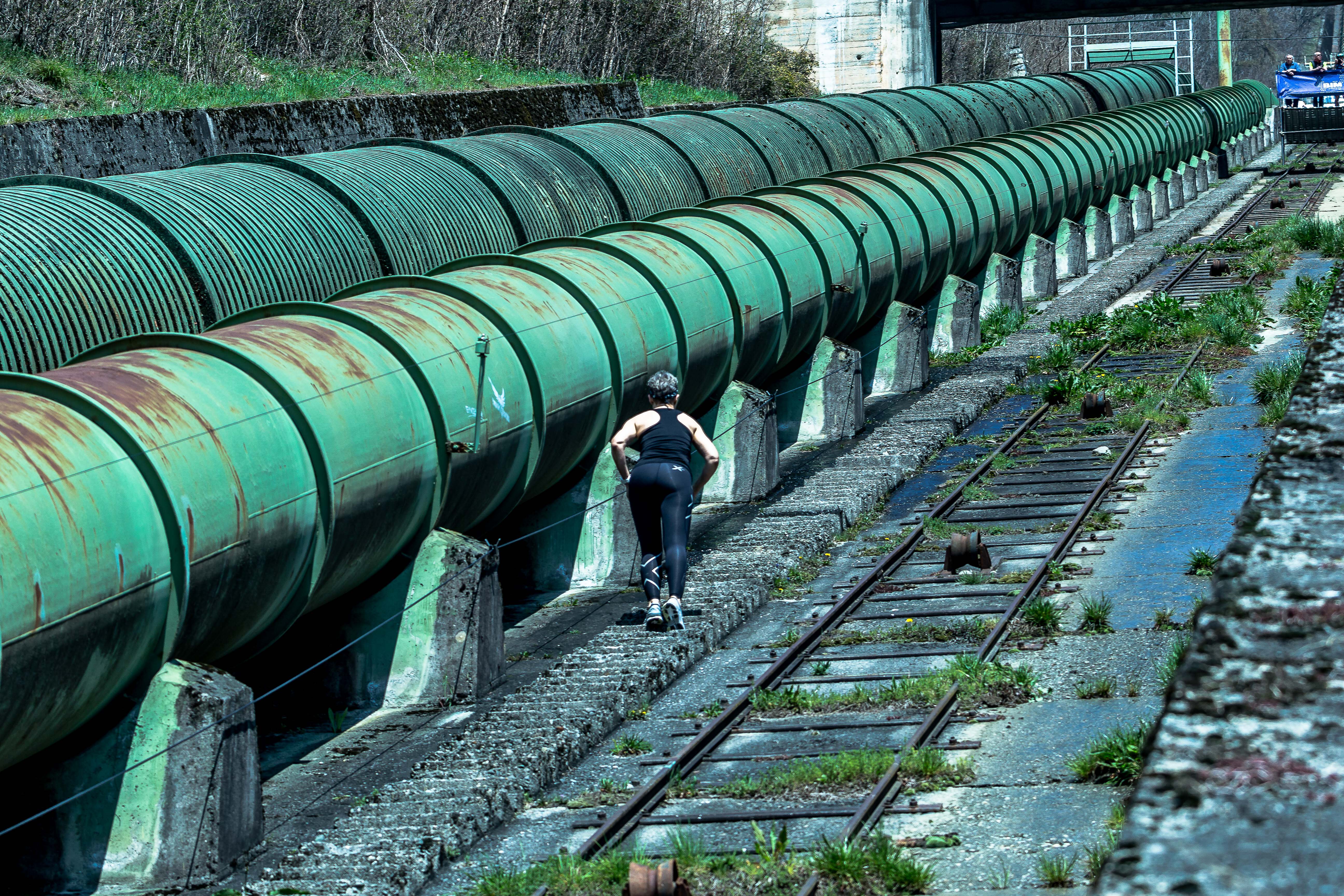 Valtellina Vertical Tube Race, held in the Italian mountains of Lombardy, Montagna in Valtellina, Sondrio. A race on a very steep staircase next to two large water supply pipes.