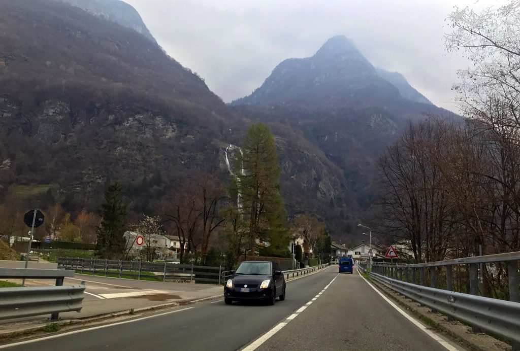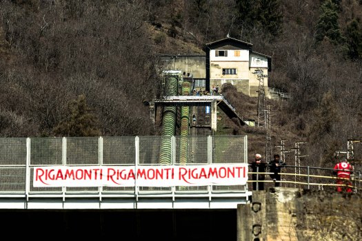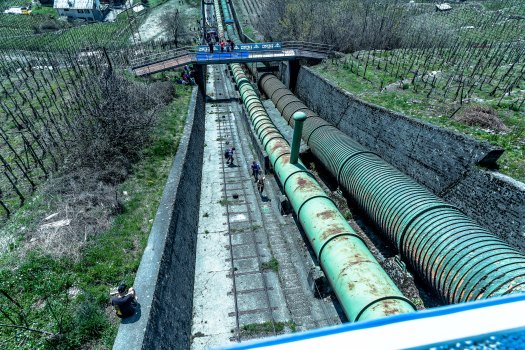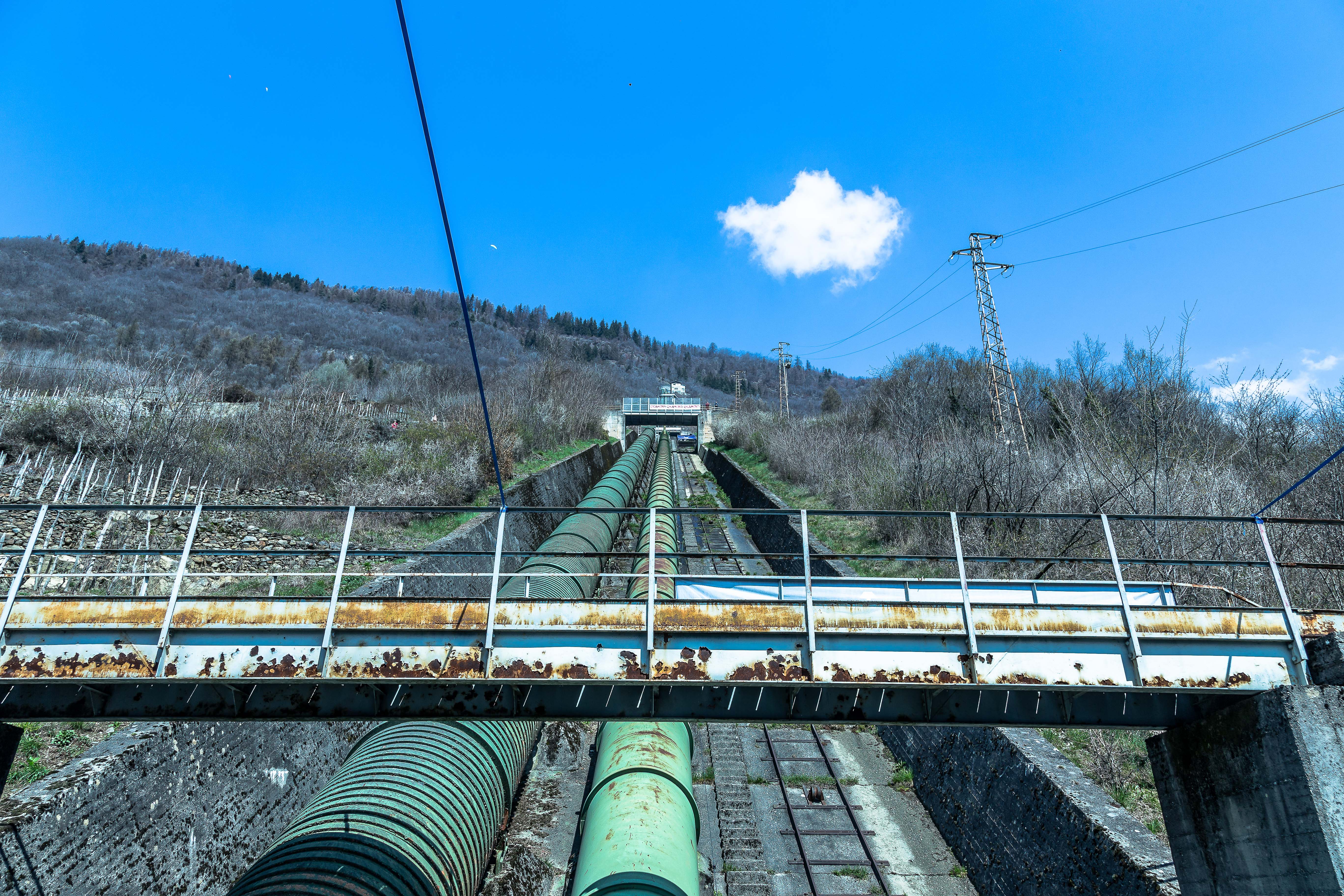 At 11:00 we drive from Sondrio center to Montagna in Valtellina, a small mountain village. It is quite easy to find the green square and the huge  tubes. We park. Henrik leaves me to go up on one of the bridges further uphill, so he can take photos photograph downwards and upwards.
